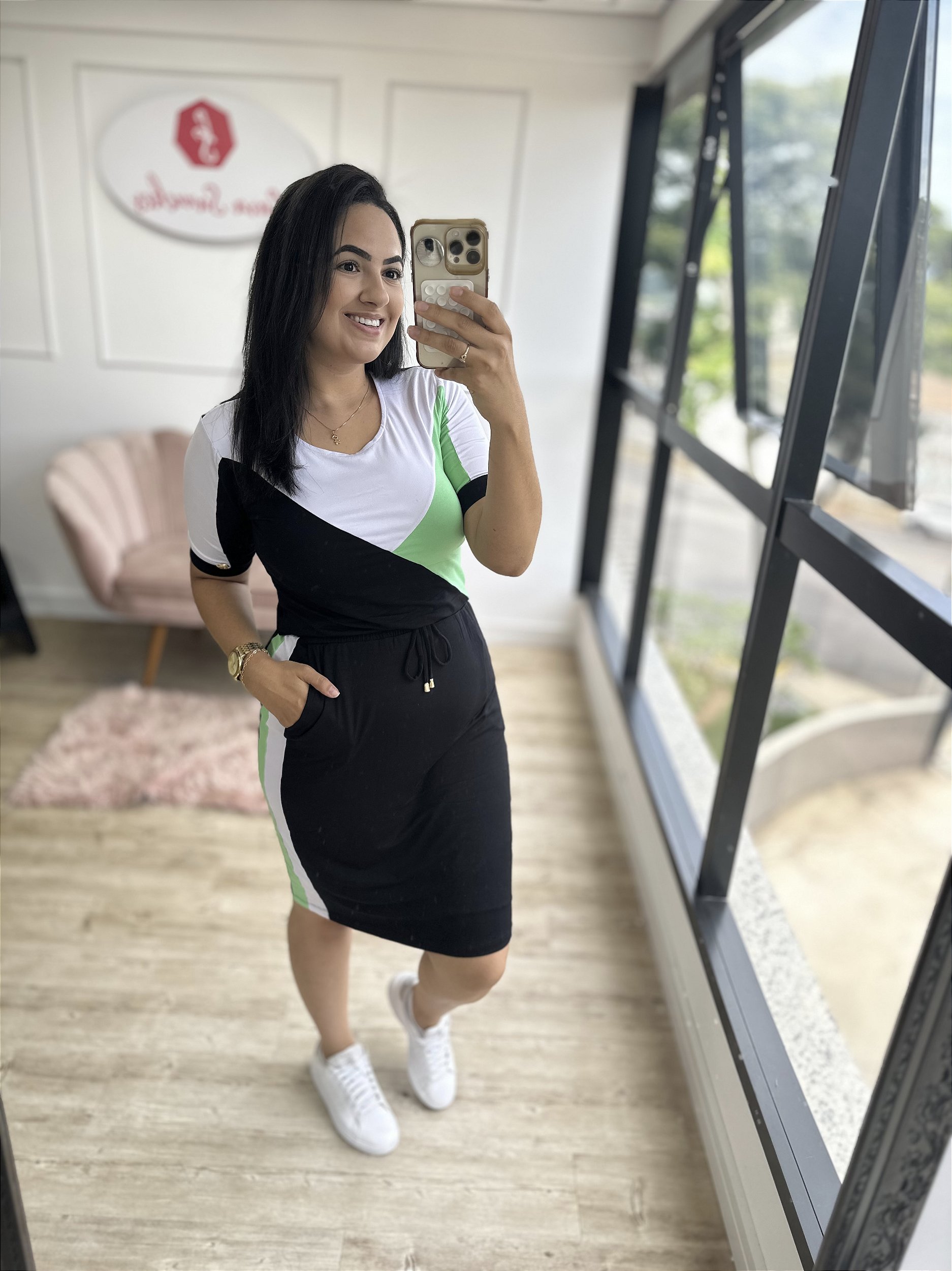 Vestido Priscila em malha super premium, recortes geométricos e bicolor, forrados com bolsos e aviamentos.